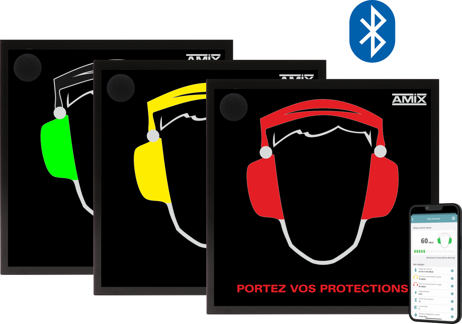 L'AMI46 affiche des seuils de niveaux sonores au moyen du pictogramme d'un casque anti-bruit lumineux, qui change de couleur en fonction de l'intensité du bruit. Une phrase “Portez vos protections”, s’allume en rouge si le niveau sonore dépasse le deuxième seuil défini. Une connectivité, Bluetooth et USB, permet une configuration aisée sur ordinateur ou sur smartphone.